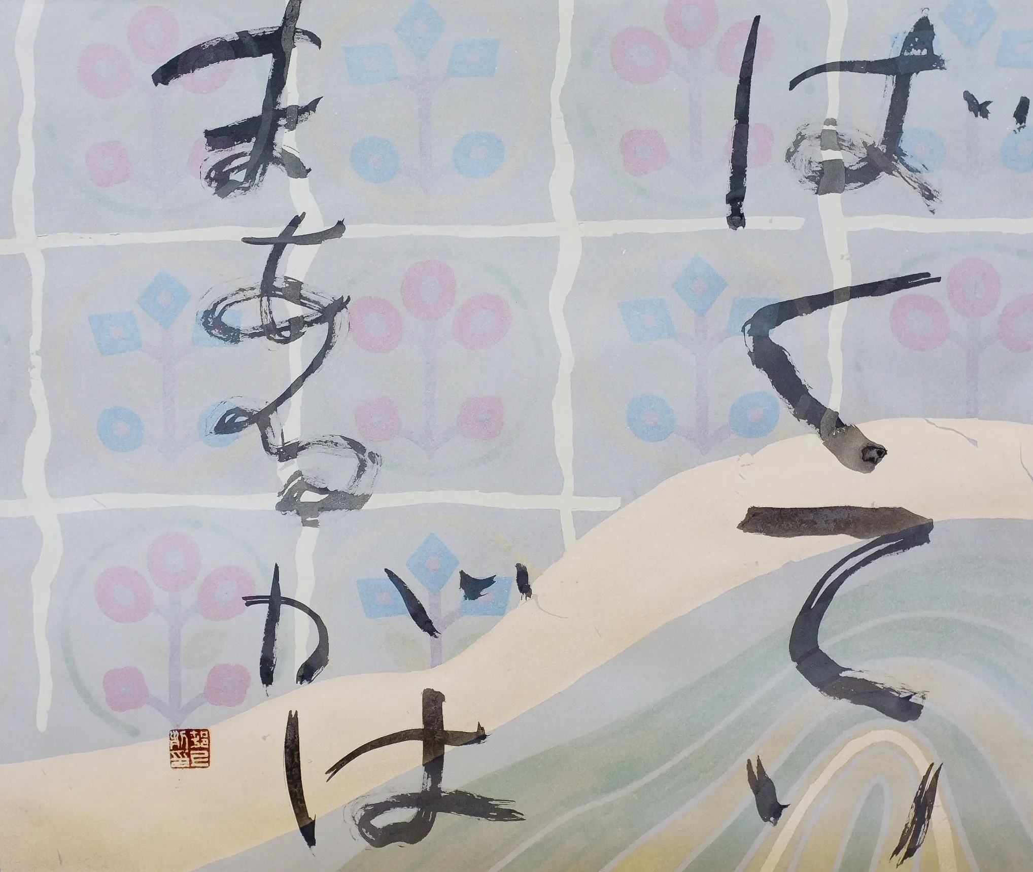 Known for his whimsical, unorthodox approach to brushing kana, Suitei forged much of his early career outside the organized calligraphy world, devoting himself to historical research and his practice. Like Aoyama San'u (1912-1993), he became an influential professor at Tokyo's Daito Bunka University; later, he joined the faculty at the University of Tsukuba in Ibaraki Prefecture. Suitei has published more than a dozen books on kana calligraphy. In 2013, the Tokyo Art Club mounted a retrospective of his work.