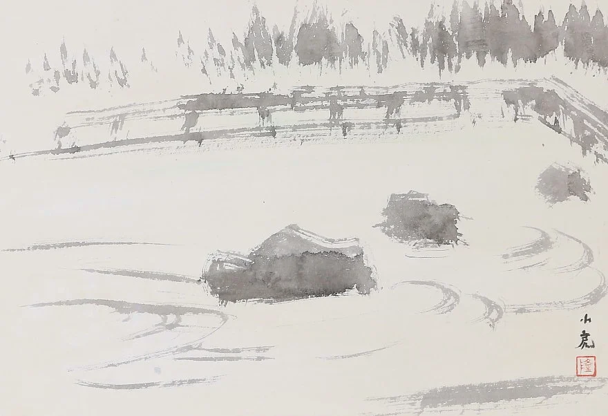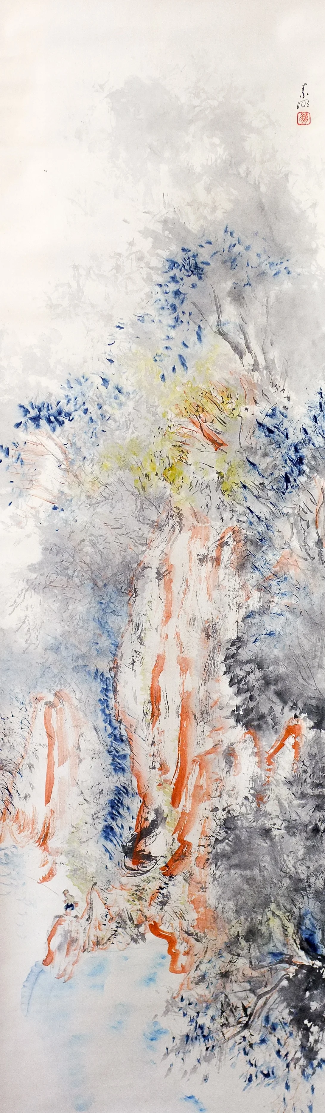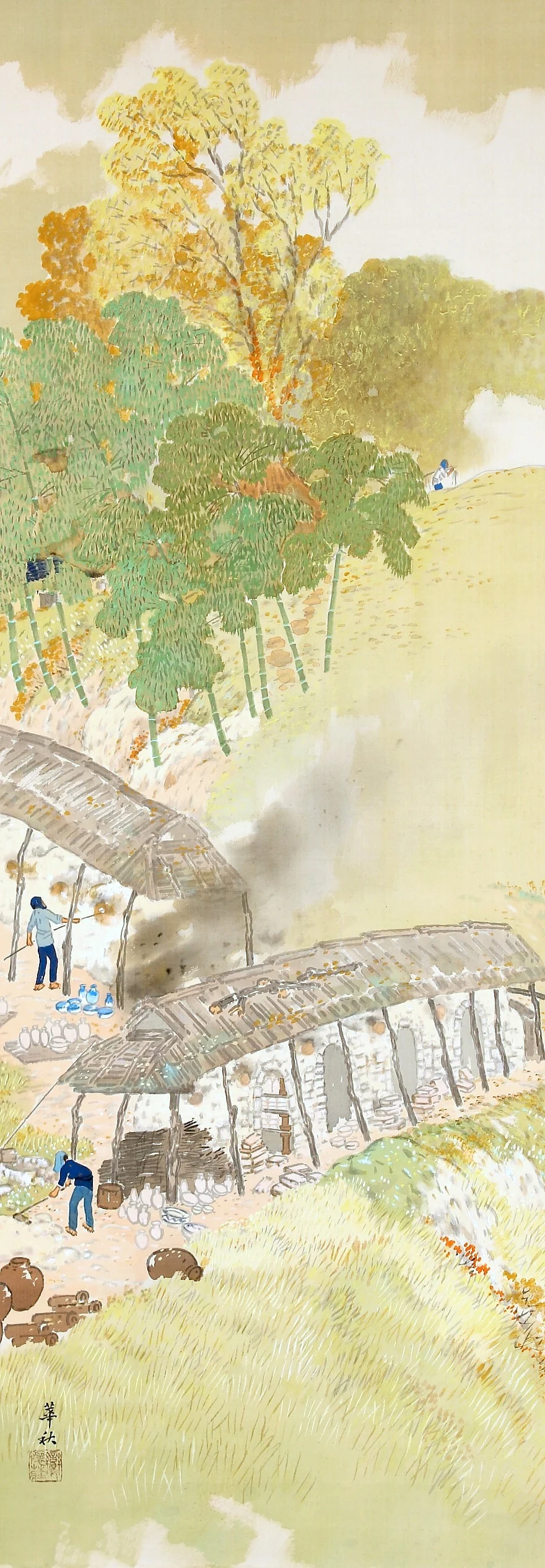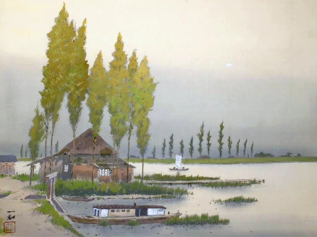 Around 1915, he joined the Sango-kai (Coral Society), an organization of Japanese-style painters, which counted Ikeda Eiji (1889-1950), Ogawa Usen (1868-1938), Ogawa Senyō (1882-1971), Kawabata Ryushi (1885-1966), Tsuruta Goro (1890-1969), Natori Shunsen (1886-1960), Yamamura Toyonari (1885-1942), Morita Tsunetomo (1881-1933) and Ishizuka Kan (active c. 1915) as members. In 1919 he started entering his distinctive Japanese-style landscape paintings in the exhibitions of the Japan Art Institute, which he later joined. He exhibited regularly in the institute’s Inten exhibitions until his resignation from the group in 1936, after which he shunned membership in any artistic group.